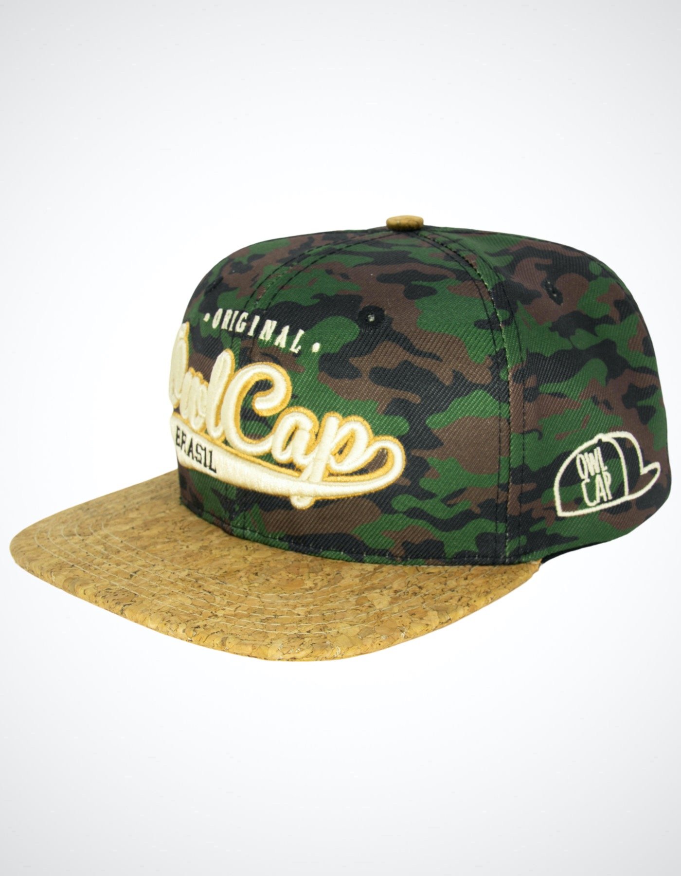 Boné Snapback Vintage Verde Navy premium da nossa coleção vintage com corpo sublimado com pattern camuflada em tons de verde e marrom, aba e contra aba e botão produzidos com tecido Premium feito de cortiça, bordado frontal com eva aplicado em alto relevo na cor branca e subcontorno em marrom caramelo.
